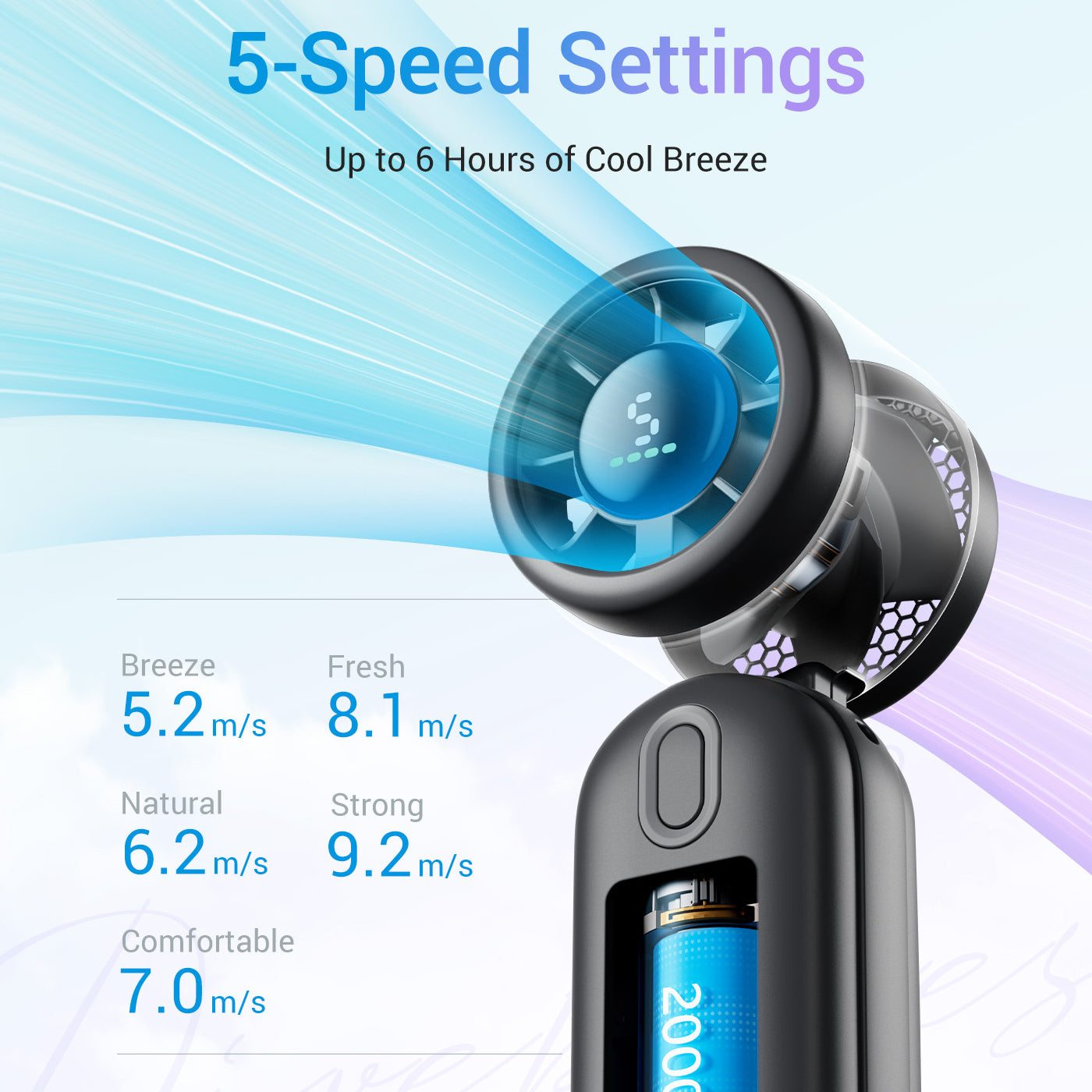 This was a great purchase! This fan has 5 speeds, it’s very powerful and it keeps you cool. The battery lasts for a long time too. I used it outdoors all summer long and it was noticeably better quality than most personal fans I observed in public. Definitely the best one I’ve ever owned. It was also small enough to fit in a medium sized handbag. I love it!