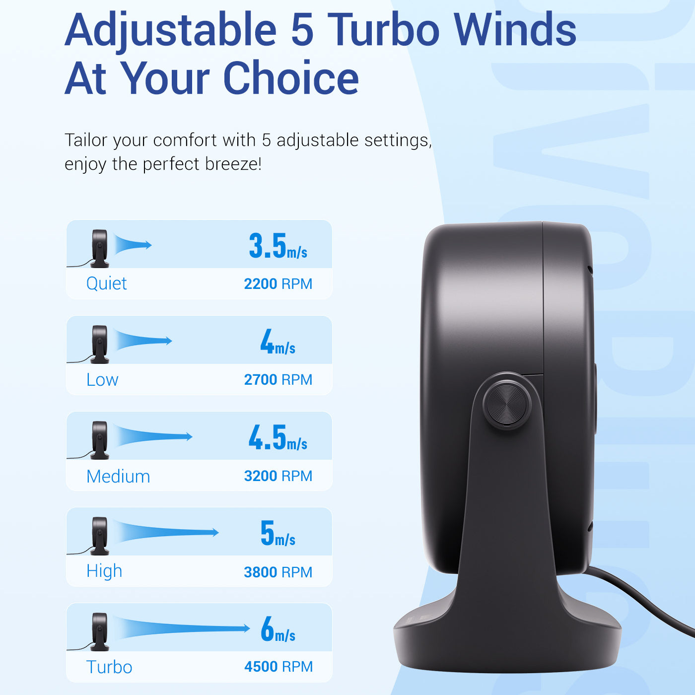 I was not expecting this little thing to be so powerful! Level 5 is more powerful then my Amazon floor fan. I bought this to keep my Tiny Whoops cool while on the bench and anything past level 2 blows it off the bench LOL!