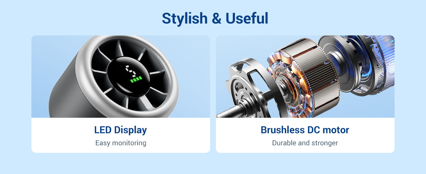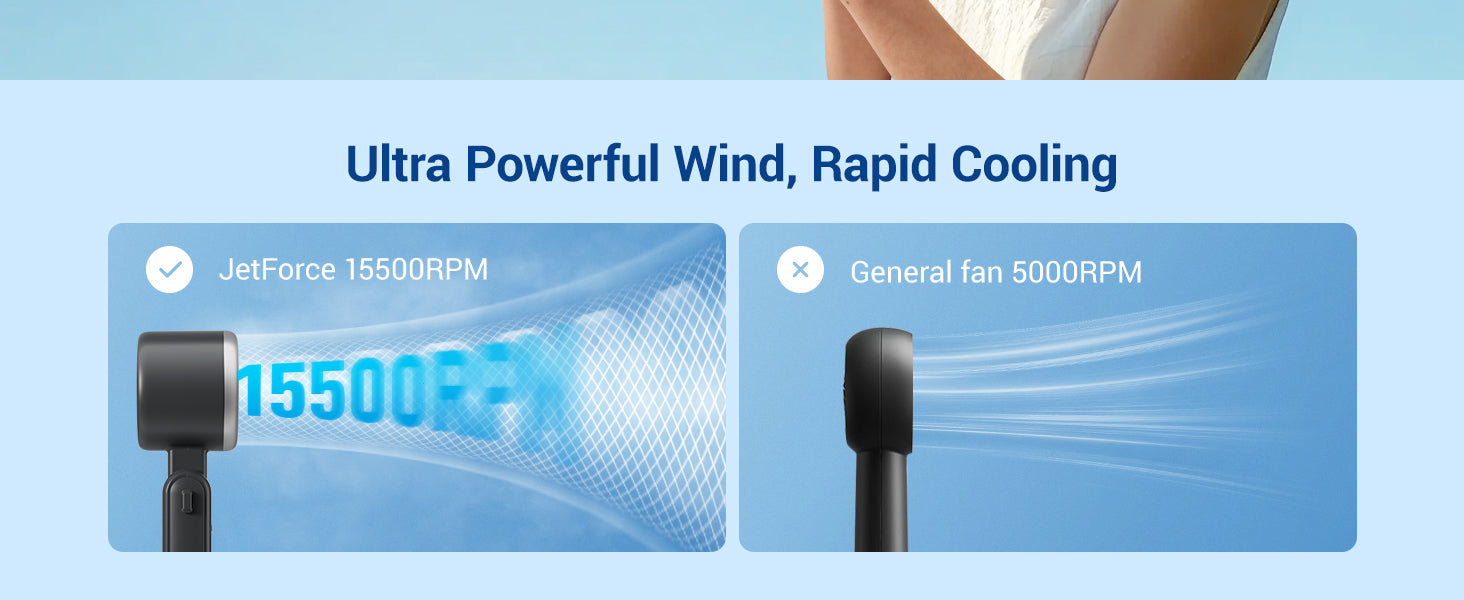 Powerful Performance: With a high-speed three-phase brushless motor and advanced 6-blade design, enjoy a maximum wind speed of up to 10m/s and 15,500 rpm, perfect for beating the heat during hot journeys.