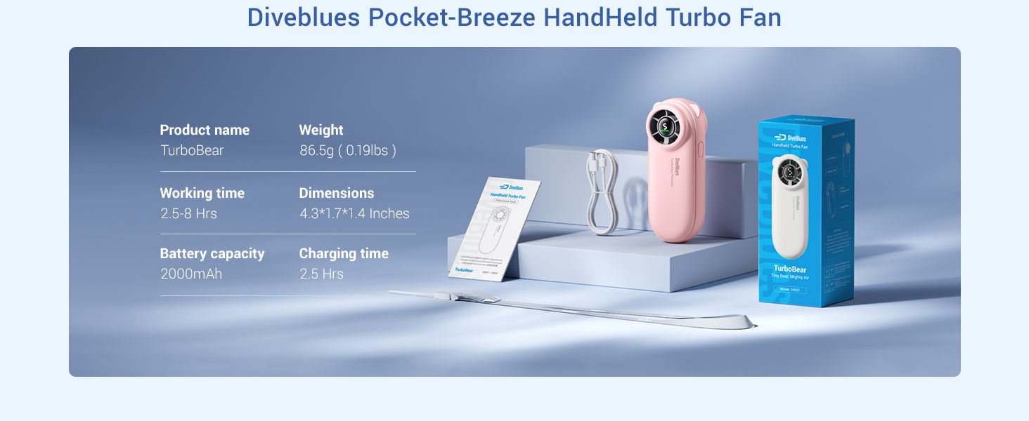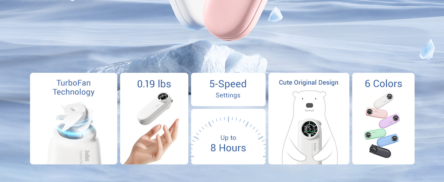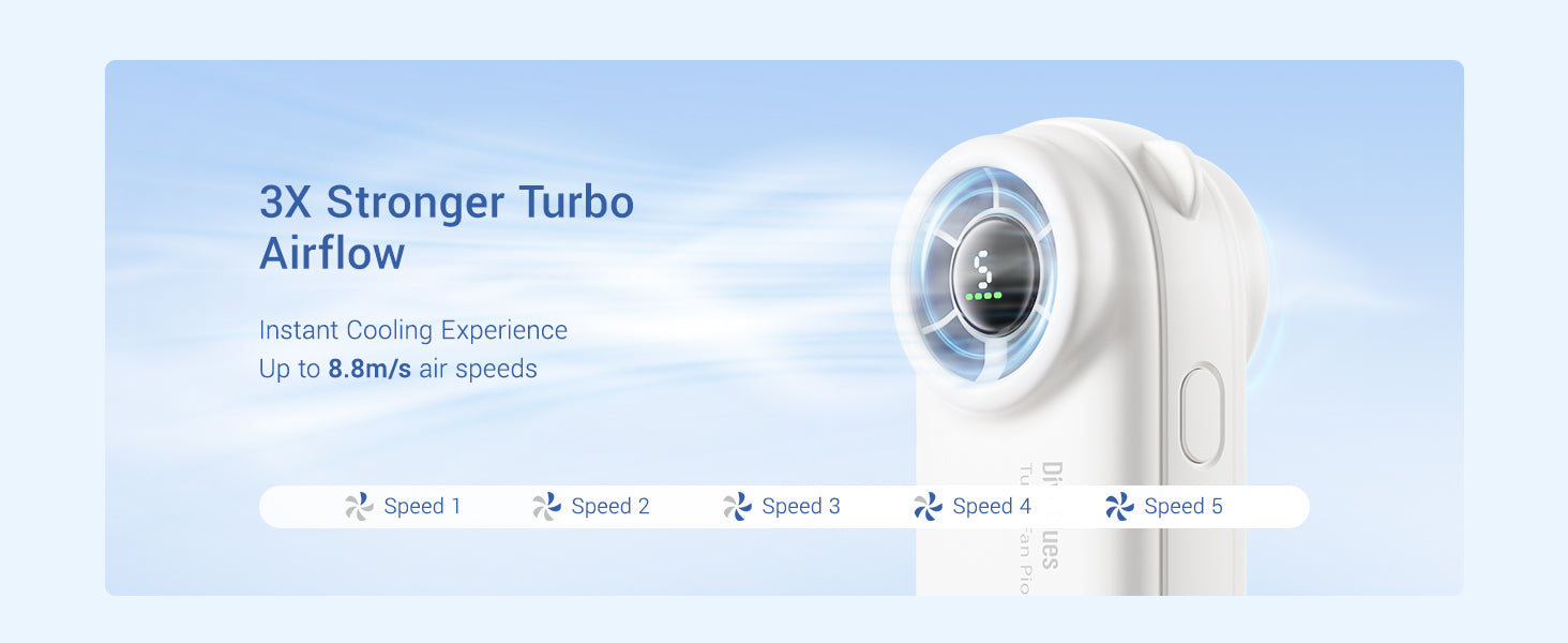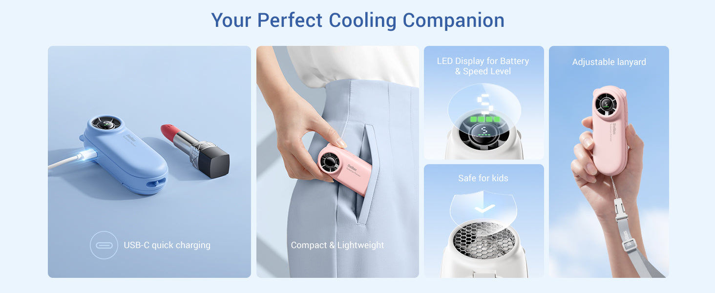 TurboBear: Compact Yet Powerful – Delivers up to 8.8m/s turbo wind speed in a pocket-sized design with a handy lanyard for hands-free cooling.