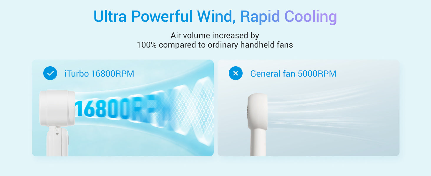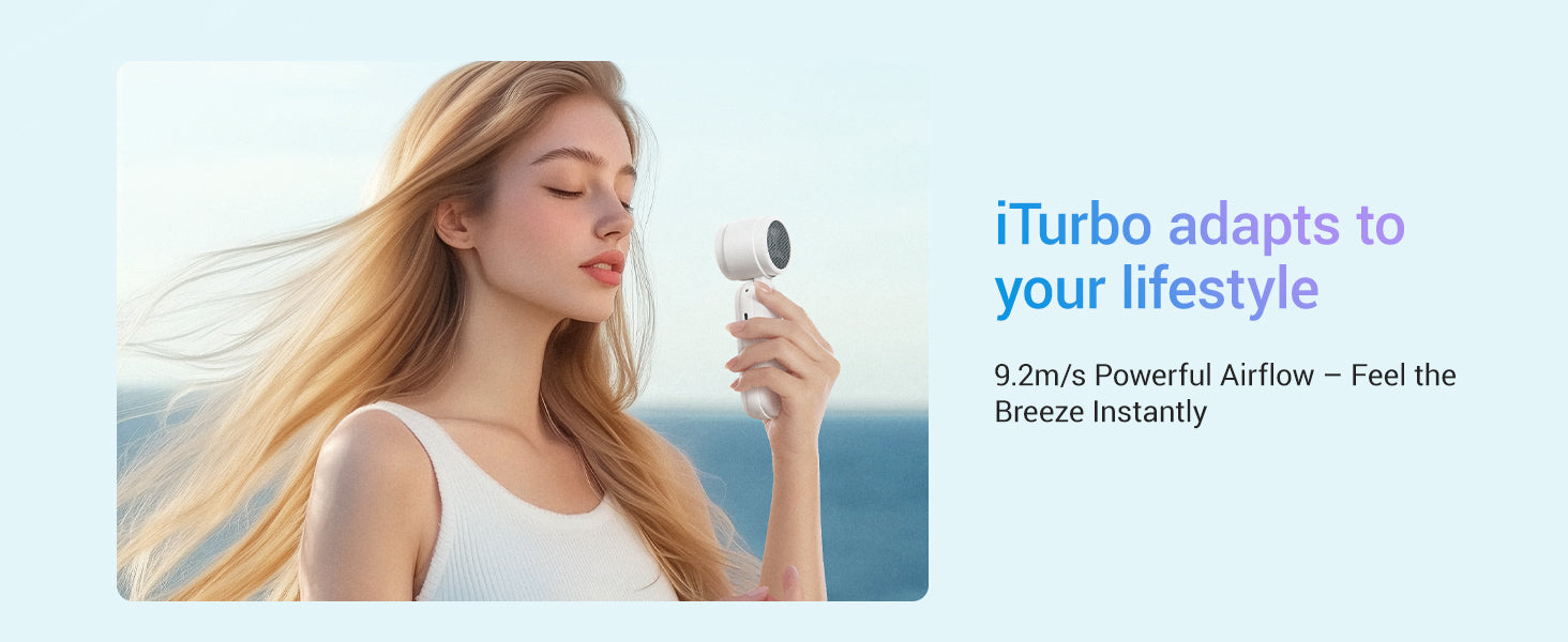 Feel instant refreshment with 9.2m/s turbo wind—3X stronger than ordinary fans. iTurbo Technology delivers high-speed cooling anywhere.