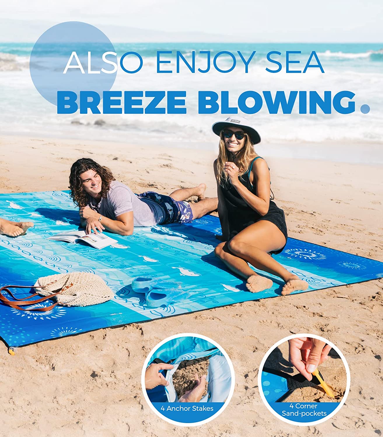 - Sand proof Beach Blanket - New material keep the sand easy cleaning off. Four sand pockets can be filled in sand or rocks to help keep your blanket grounded on the beach. Four stake loops to keep it grounded on firmer ground. No need to worry about mat getting crumpled or ripped.